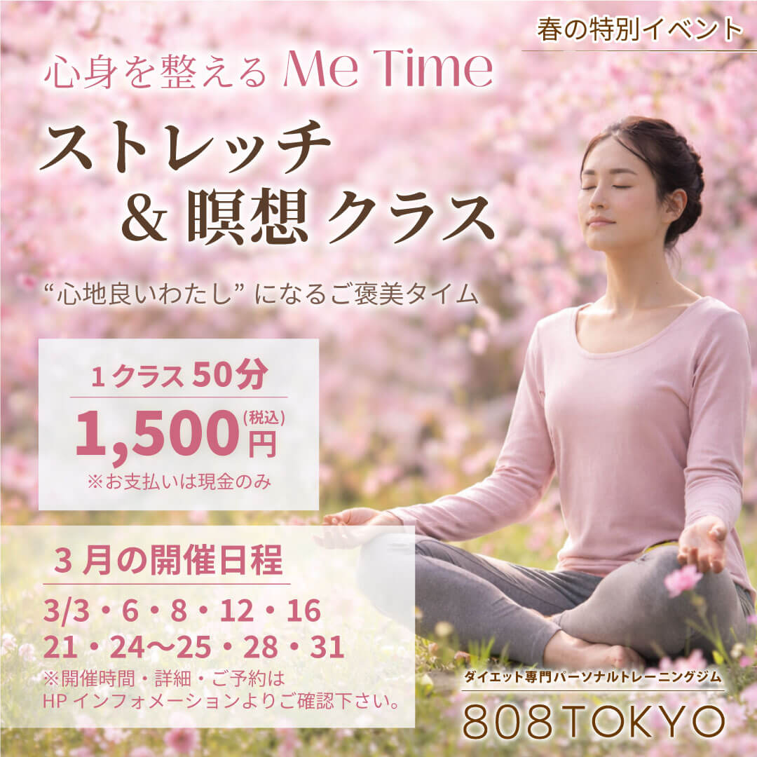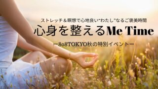10月21日より808TOKYO初のストレッチ&瞑想イベント~ 心身を整えるMe Time ~を開催いたします。パソコンやスマホ・SNSの普及により気付かないうちに疲労している心身を解きほぐし、心地良い私になるご褒美タイムを808で過ごしませんか。