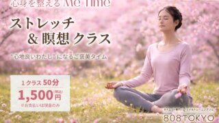 808TOKYOによるストレッチ&瞑想クラス~ 心身を整えるMe Time ~。3月のご予約を開始しました。溜まった心身の疲れを解きほぐし、心地良い”わたし” になる自分へのご褒美タイム』をコンセプトに、身体の細部まで伸ばすストレッチと心地の良いマインド作りを意識した呼吸瞑想で心身のストレスにアプローチしていきます。