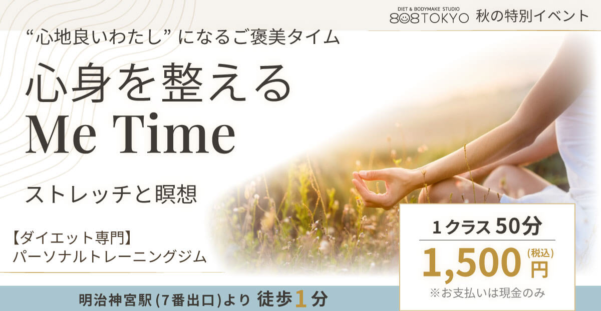 スマホやSNSの普及で気付かないうちに疲労している心(脳内)と身体を808TOKYOのストレッチと瞑想で解きほぐし、心地良い私へ変える自分へのご褒美タイム。